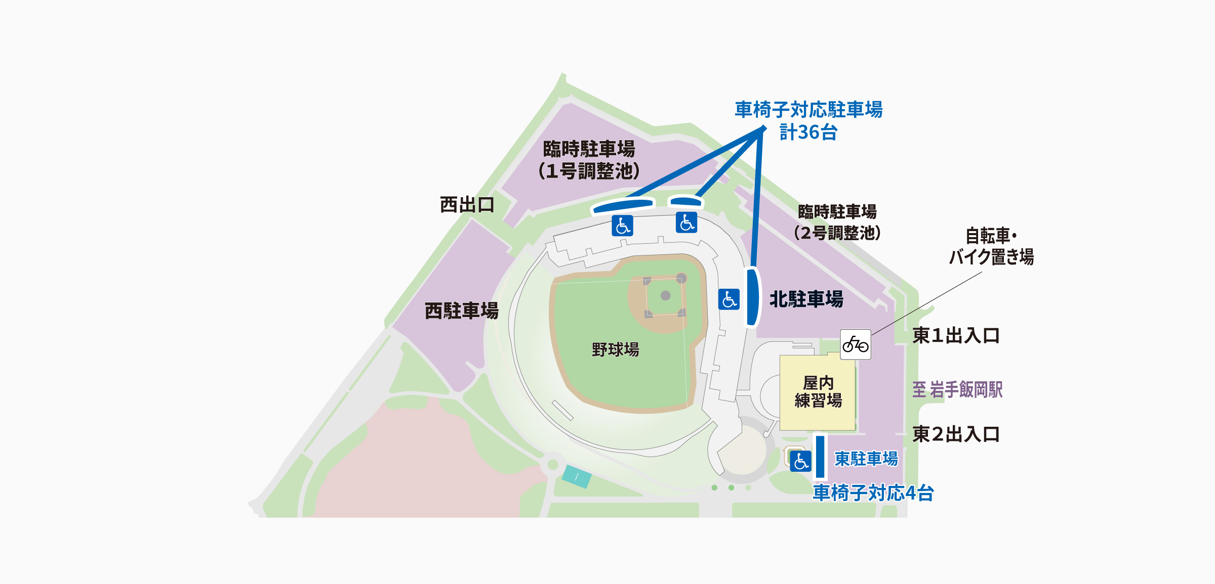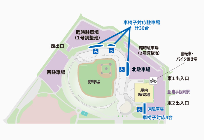 野球場周囲36台、東駐車場4台、合計40台分の車いす駐車場を整備しています。