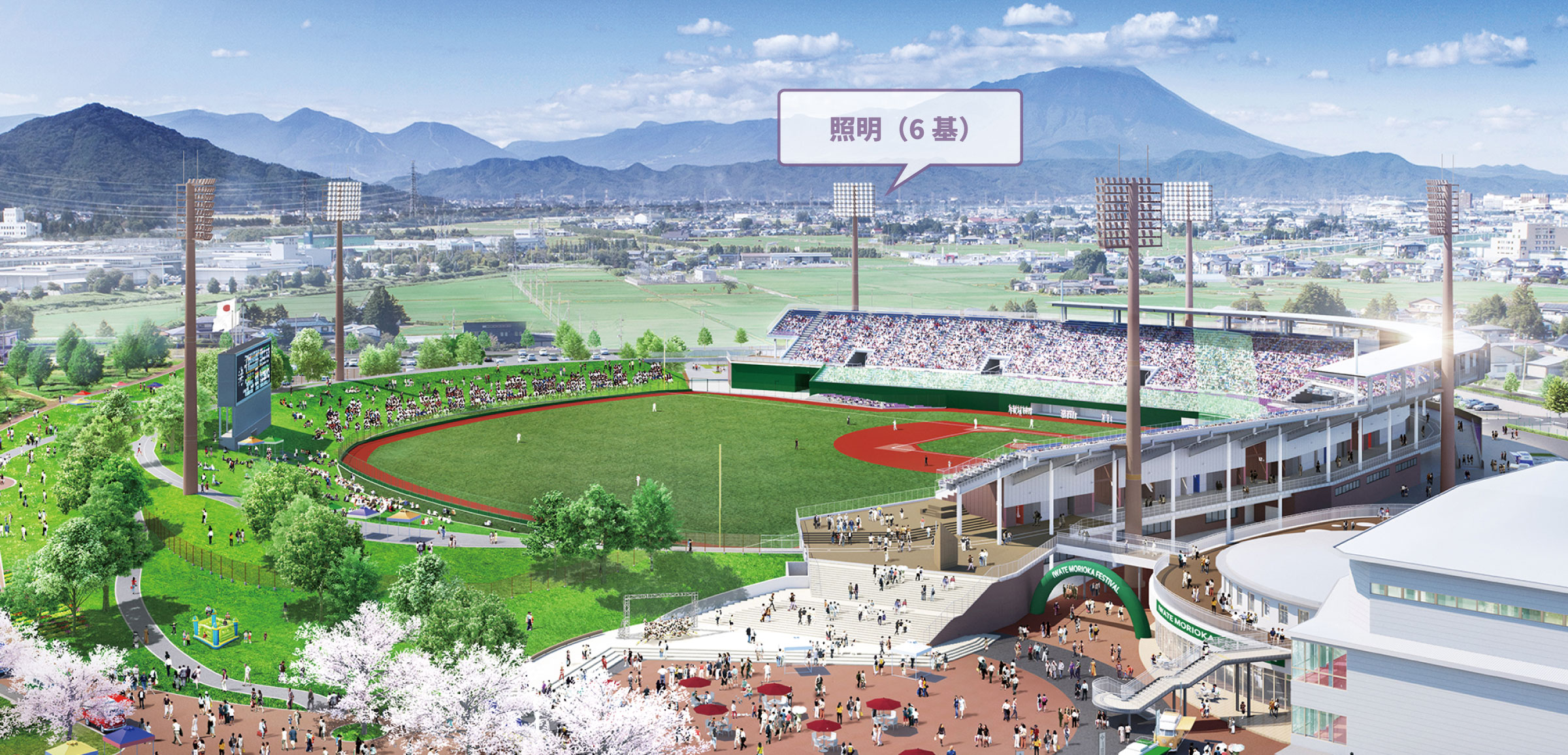 スポットライトなどイベント演出も可能。照明塔全6基に照明台数214台設置、4段階の照度設定ができます。